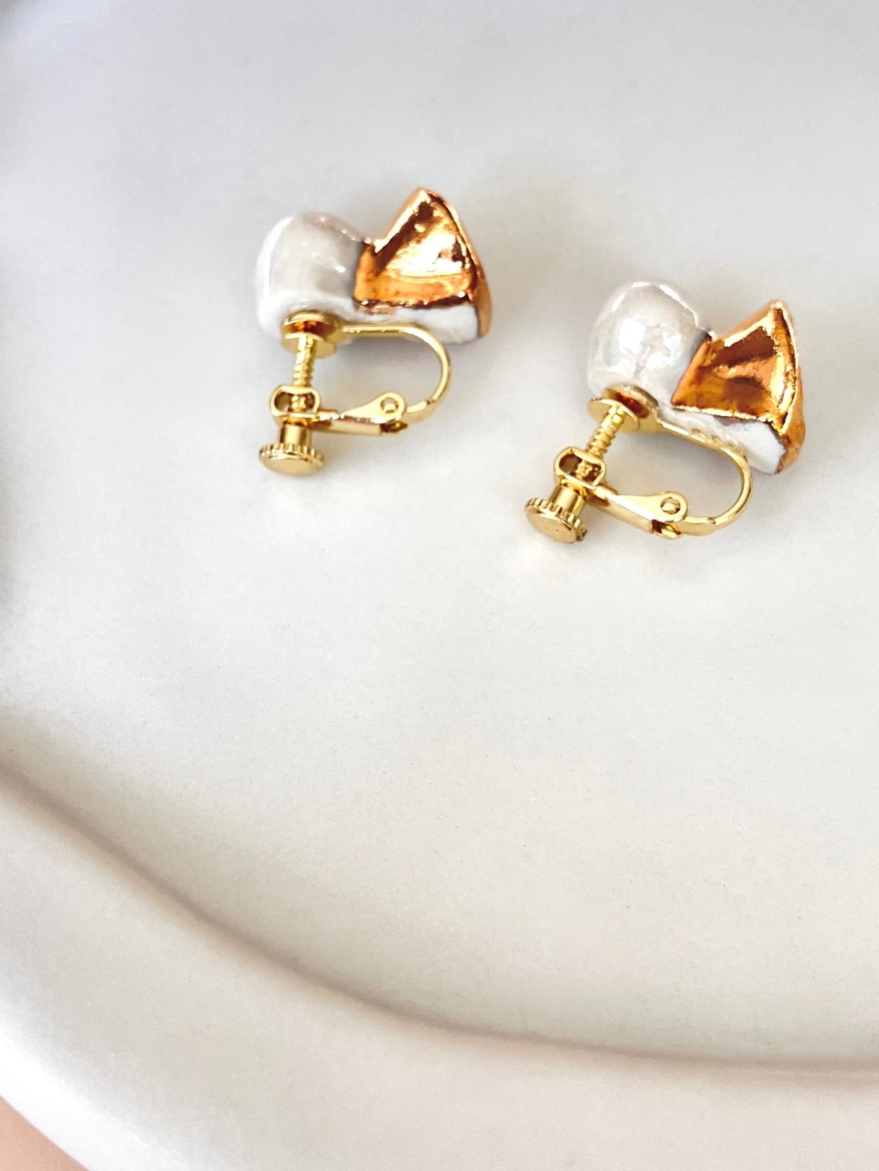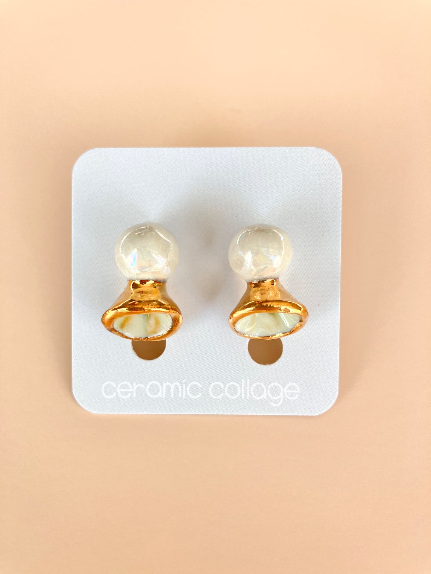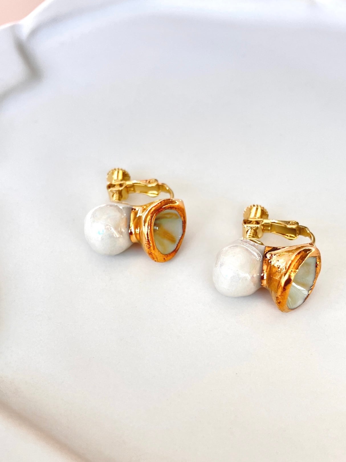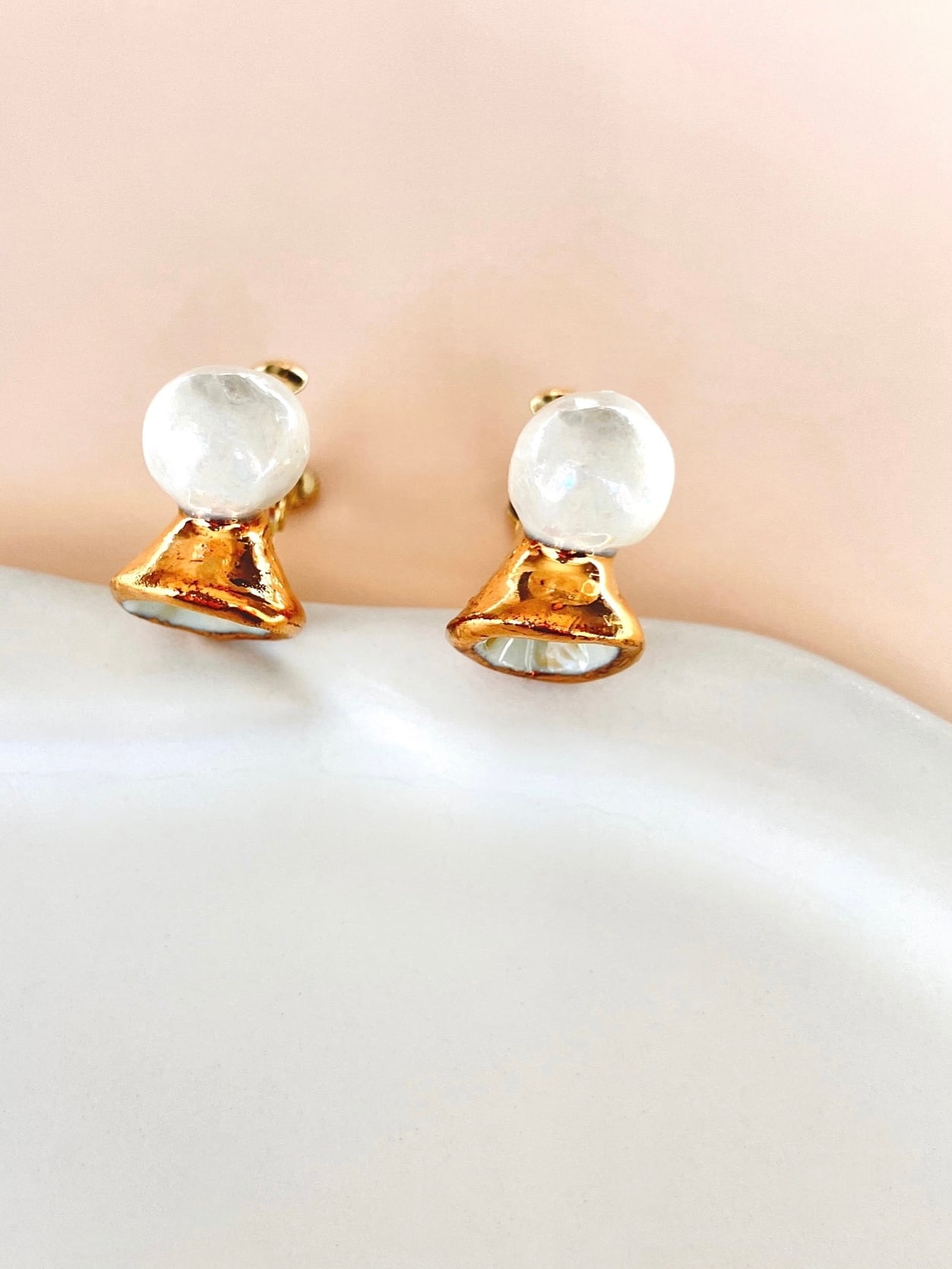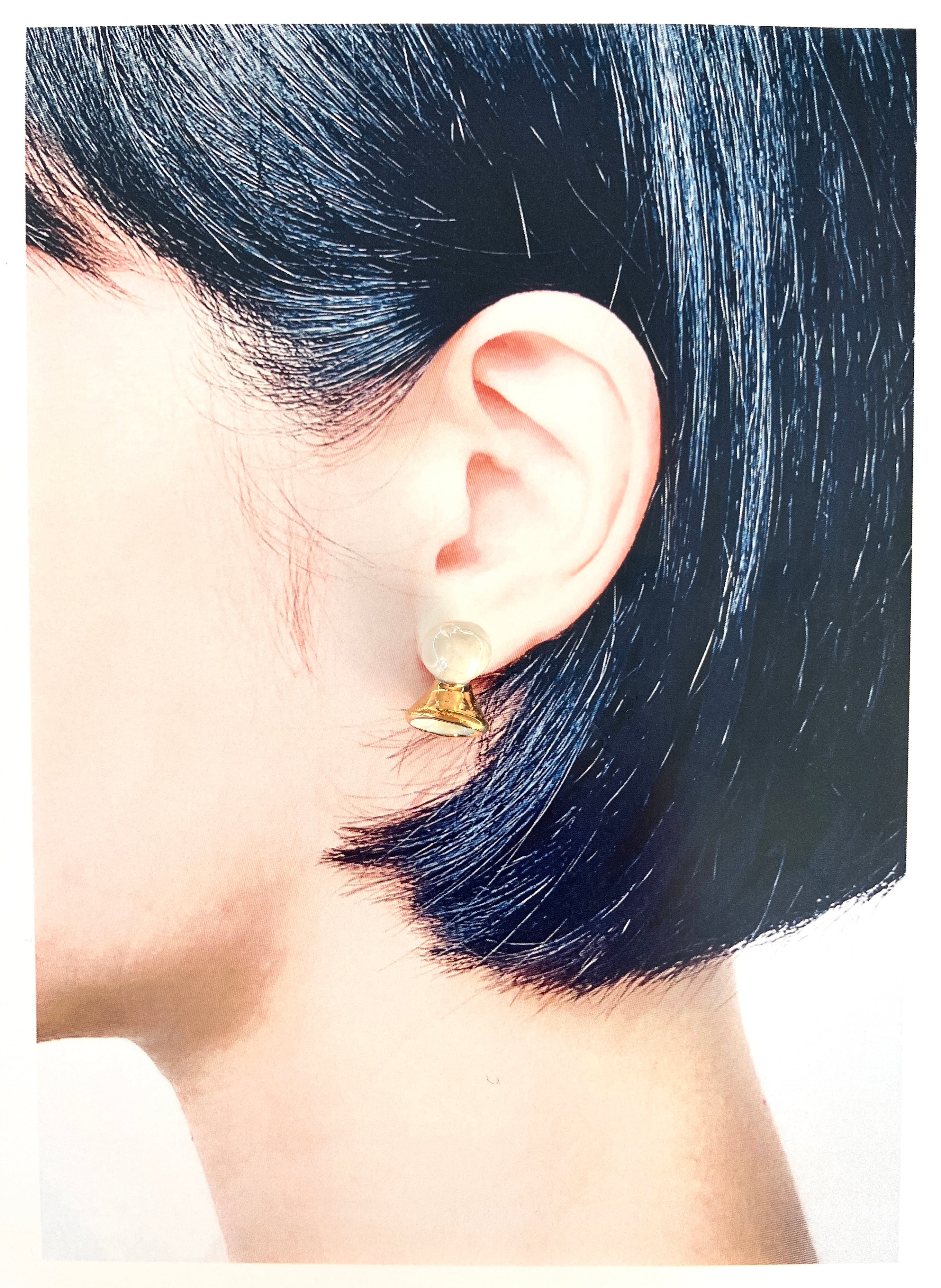 パールカラーの大きめの丸いパーツの下に金色の円錐のような形が目を惹きます。