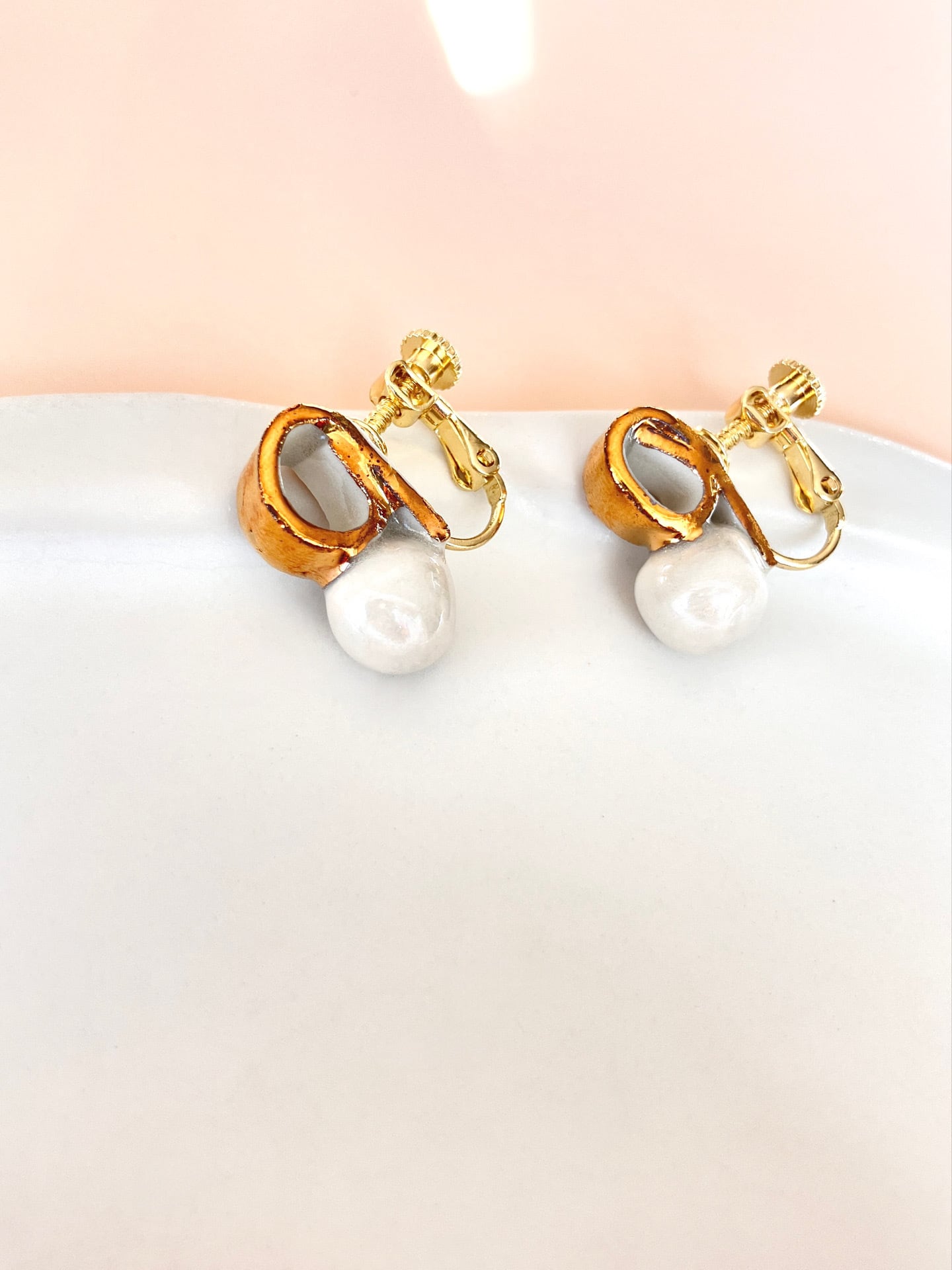 くるりと巻いた金色のリボンのような形の端にパールカラーの少し歪んだ丸い形が付いています。